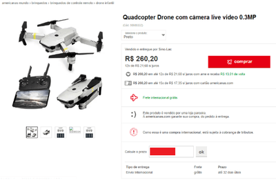 Em uma pequena simulação feita pelo Promobit, usamos como exemplo o drone Quadcopter Drone com câmera live video 0.3MP, que custa R$ 260,20 no site da loja e é vendido pela parceira chinesa Sino-Lac.