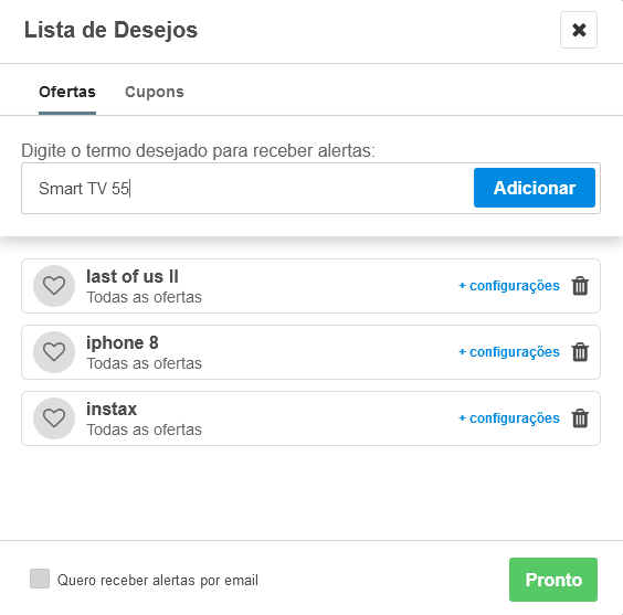 Por exemplo, se você decidir adicionar o termo “smartphone” na sua Lista de Desejos e decidir que o seu preço mínimo é R$ 800,00, você não receberá notificações de modelos mais baratos.