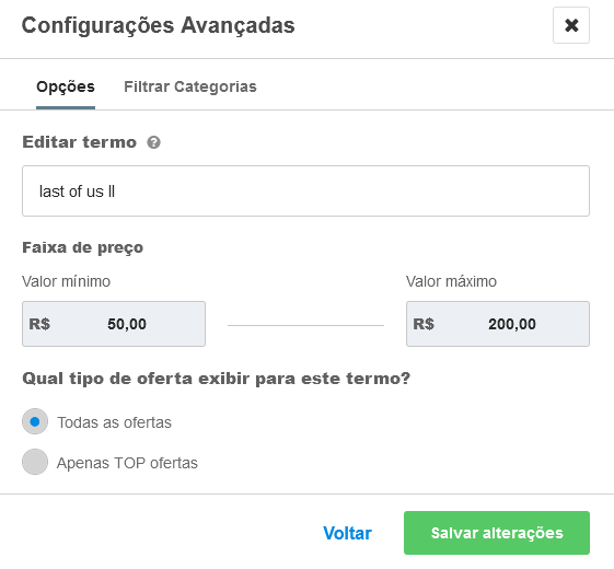 Por exemplo, se você está procurando um iPhone, você poderá receber apenas ofertas entre R$ 2.000,00 e R$ 2.500,00.