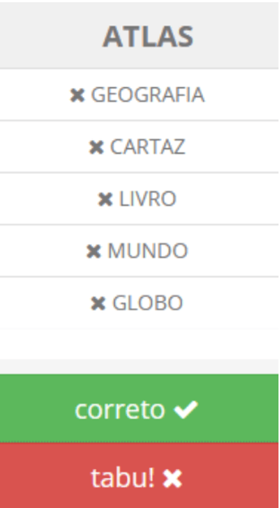 Tabu é um simples jogo de palavras que pode ser jogado em times ou até em duplas, com versão física e também online. Uma pessoa pega uma carta, que vem com uma palavra em destaque como “Atlas”. Quem tirou a carta precisa explicar essa palavra para os outros jogadores sem falar “Atlas” ou qualquer uma das outras palavras relacionadas, como “geografia”, “mundo” etc.