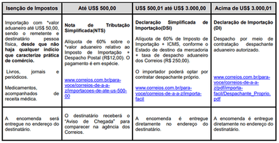 Alguns artigos na internet dizem que a isenção de impostos só é válida para compras até US$ 50 (ou o equivalente em moedas estrangeiras), desde que remetente e destinatário sejam pessoas físicas, enquanto outros informam que a isenção também vale para compras até US$ 100, exigindo que apenas o destinatário seja pessoa física.