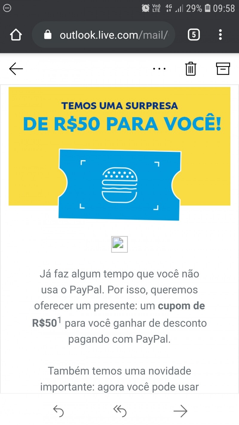 Você acaba de ganhar 1 cupom de R$50 para comprar com PayPal. Clique em "Salvar oferta", use login e senha da sua conta do PayPal e a oferta estará disponível na sua Carteira. Essa é uma oferta válida somente para titulares de contas do PayPal Brasil que receberam o e-mail correspondente a esta promoção. A oferta termina em 10 dias e você pode checar a data de validade consultando o cupom em sua conta PayPal.